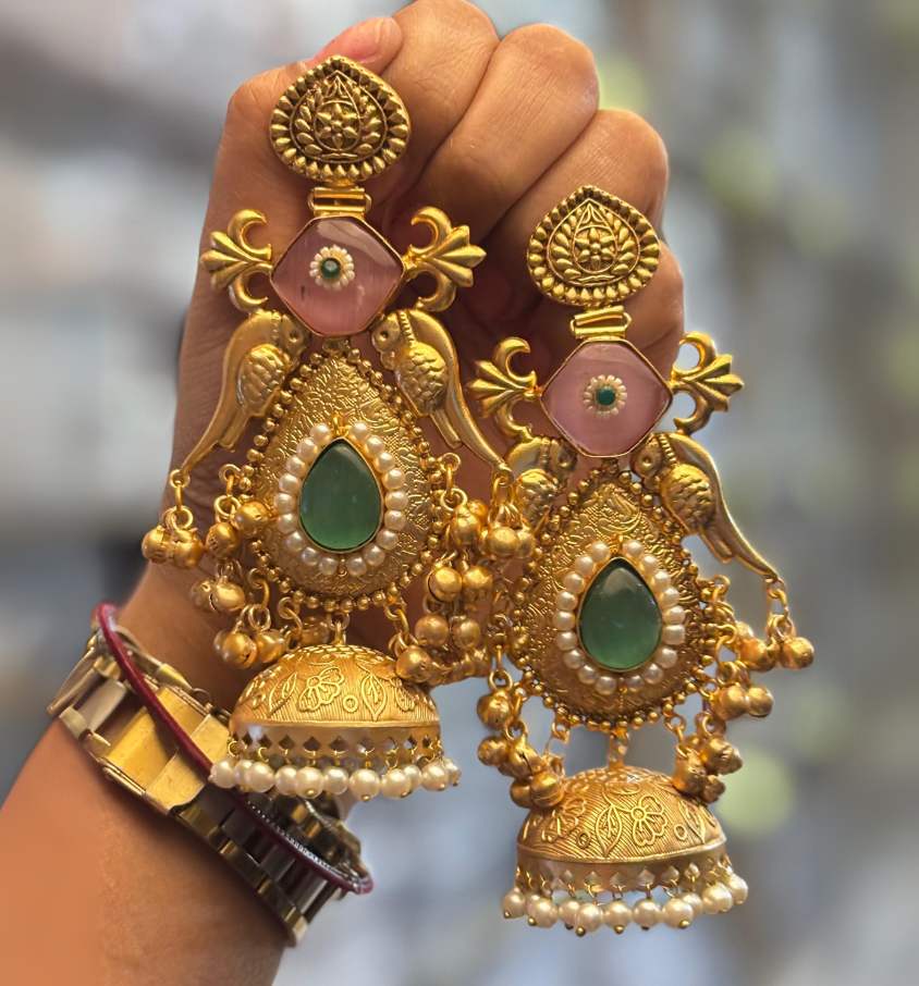 Make a majestic statement with these grand gold-toned peacock jhumka earrings. Each intricate earring features a detailed peacock motif at the top, leading to a large jhumka bell adorned with delicate pearl drops. Striking pink and green imitation stones add a vibrant pop of color, making these earrings perfect for weddings, festive occasions, and traditional celebrations.