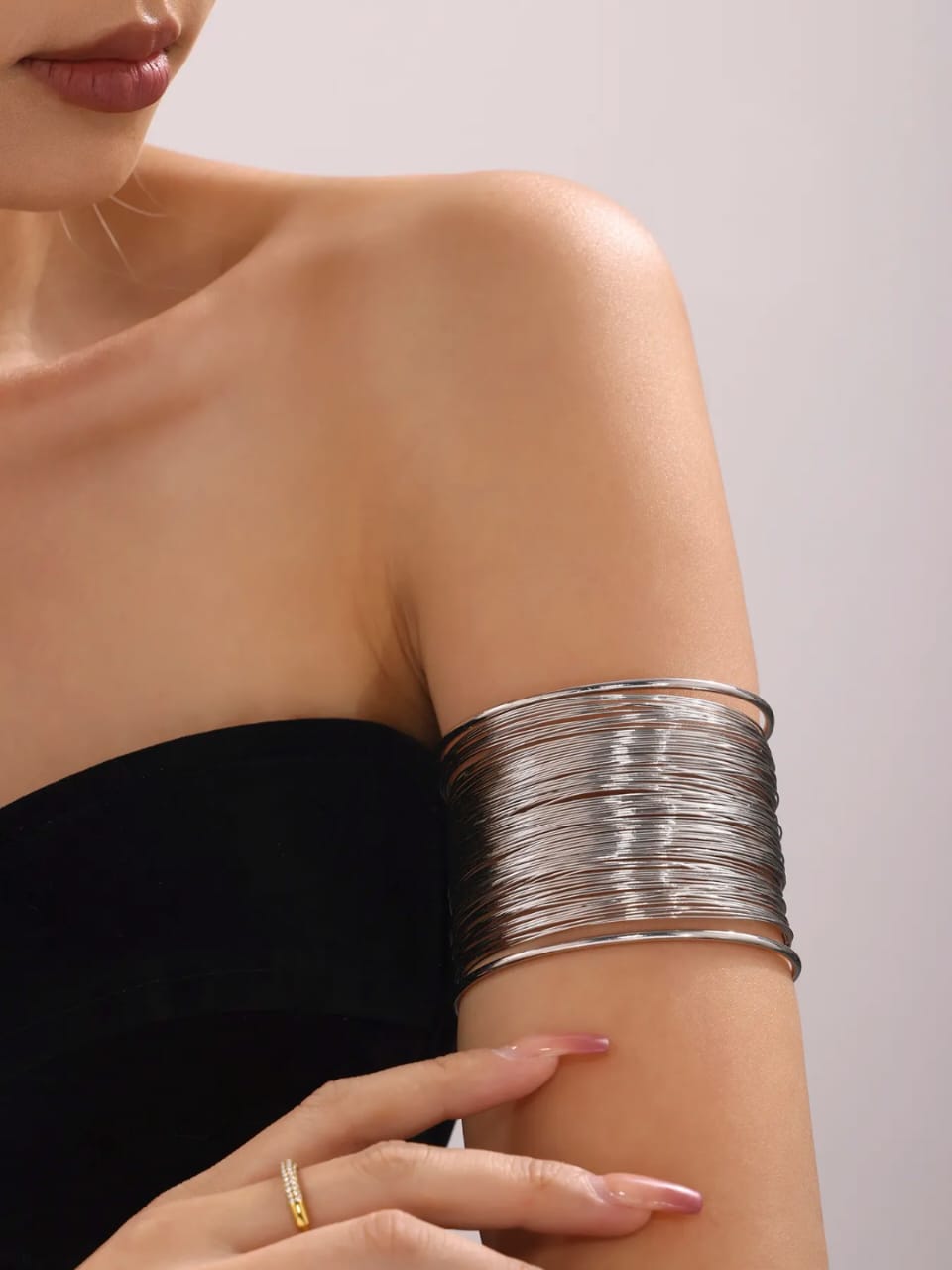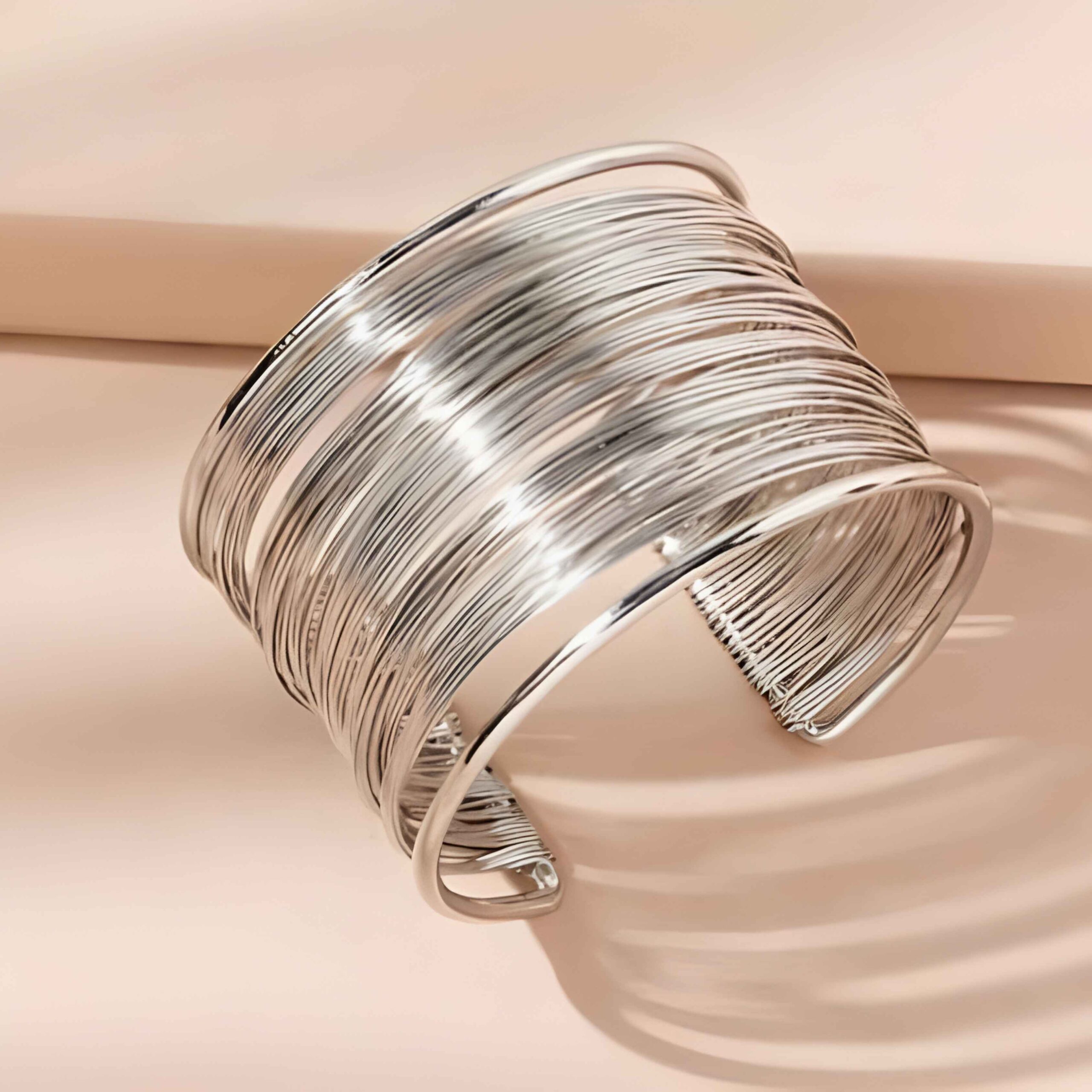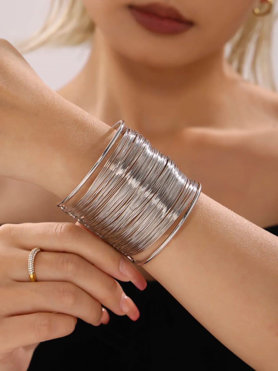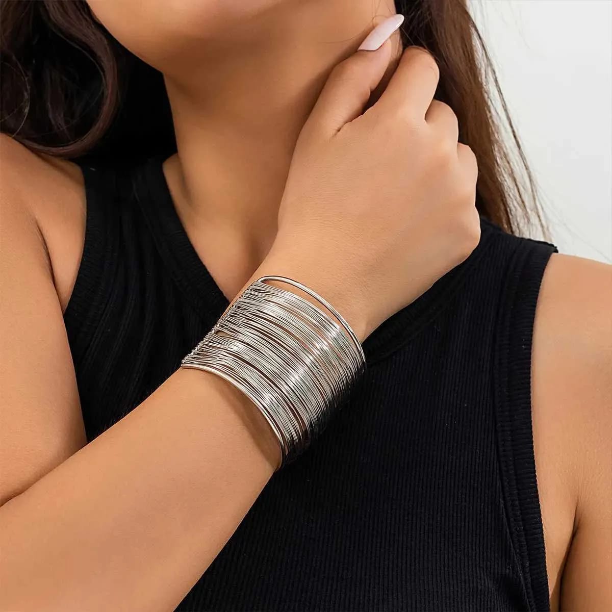 The bracelet features an extra-wide cuff design crafted from numerous fine, concentric silver-tone wires that are bound together to create a stunning, voluminous effect. The sleek, polished finish and its wide profile make it an instant focal point for any outfit—from a sleek evening gown to a simple blazer and jeans.
