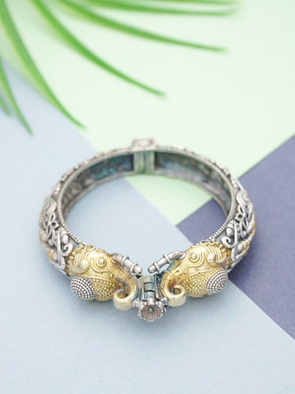 Make a striking statement with this unique kada featuring beautifully sculpted elephant heads that serve as the opening mechanism. The rich golden detailing on the elephant heads and the textured silver band create a captivating contrast. This piece is a testament to intricate design and artistic flair, perfect for those who appreciate bold and distinctive jewelry.