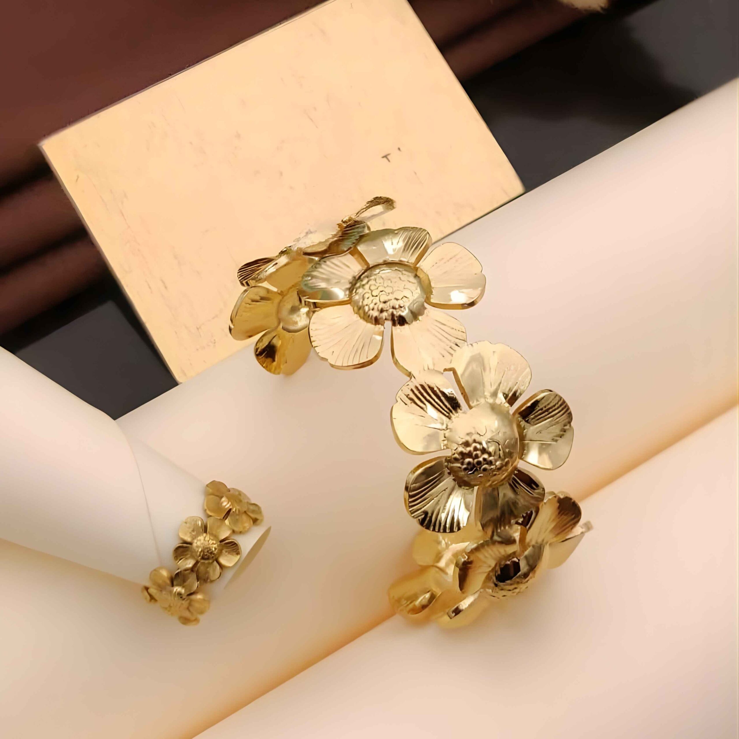 The cuff bracelet wraps elegantly around the wrist, and the ring features a band covered in miniature blooms. Both pieces are crafted from durable Anti-Tarnish Stainless Steel with a high-shine gold-tone finish, ensuring long-lasting wear and brilliance. This set is perfect for making a vibrant, coordinated statement.
