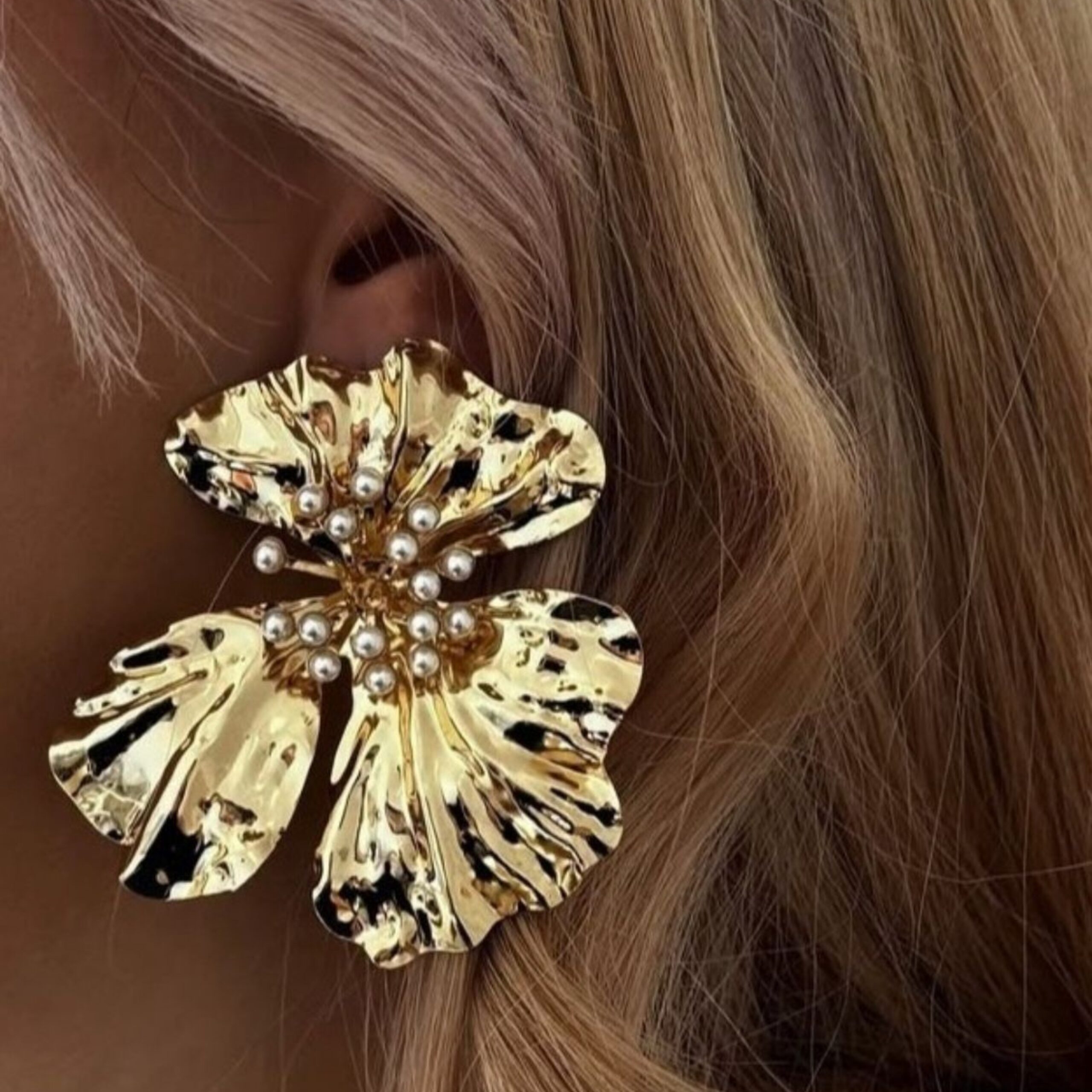 The center of each bloom is beautifully accented with a cluster of tiny faux seed pearls, adding a soft, classic touch that contrasts beautifully with the bold gold texture. Crafted from durable Anti-Tarnish Stainless Steel, these earrings are built for comfortable wear and long-lasting brilliance, perfect for weddings, parties, or high-fashion looks.