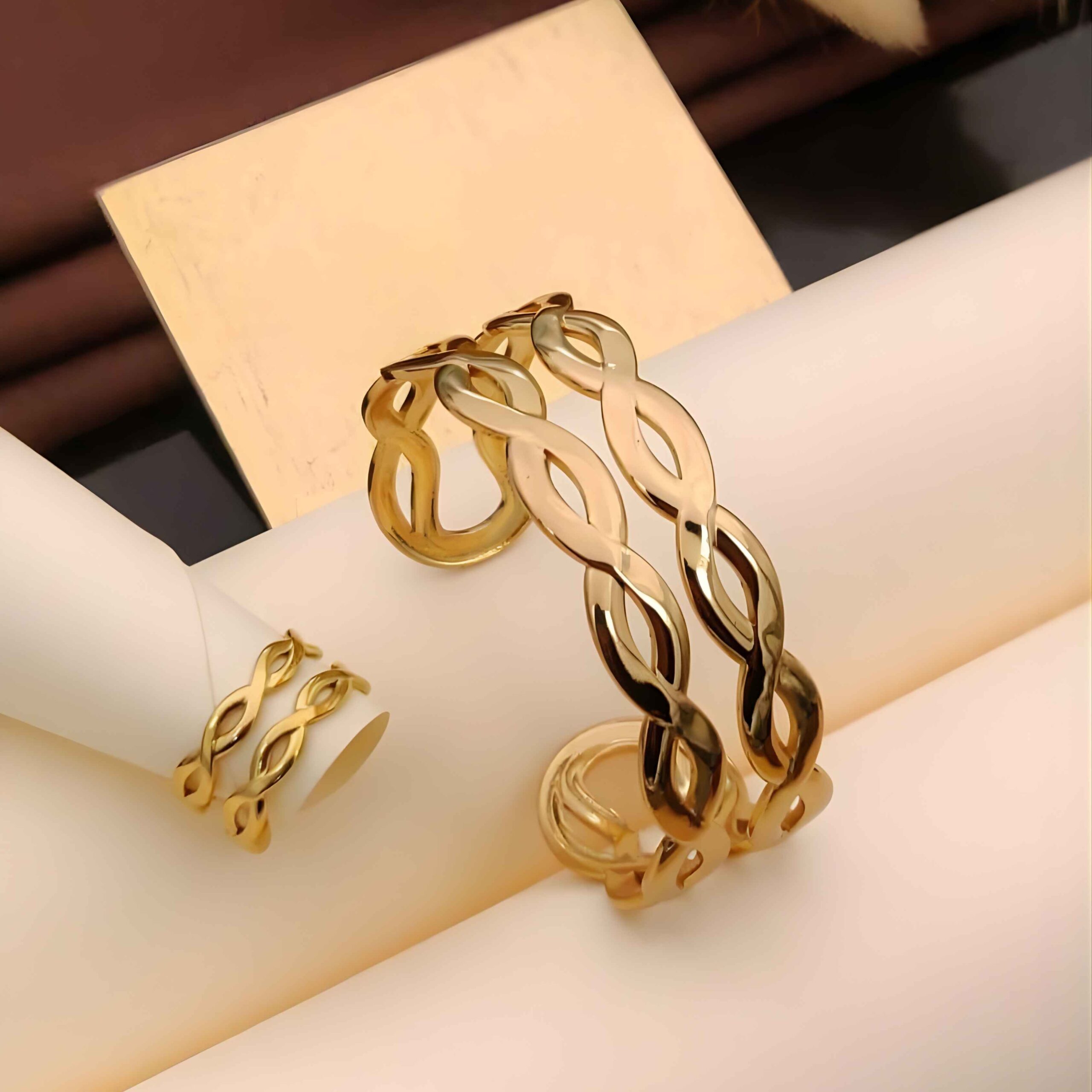 The cuff bracelet spans wide across the wrist for a major statement. The ring offers a perfectly coordinated, scaled-down version that wraps around the finger. Both pieces are crafted from durable Anti-Tarnish Stainless Steel with a high-shine gold-tone finish, ensuring long-lasting brilliance and reliable, comfortable wear.