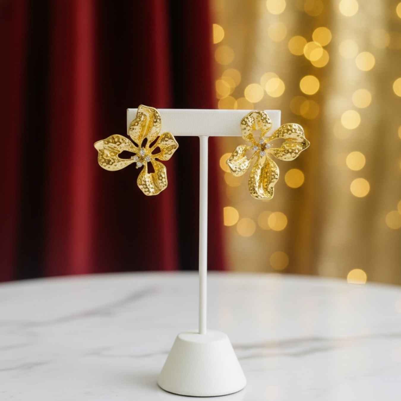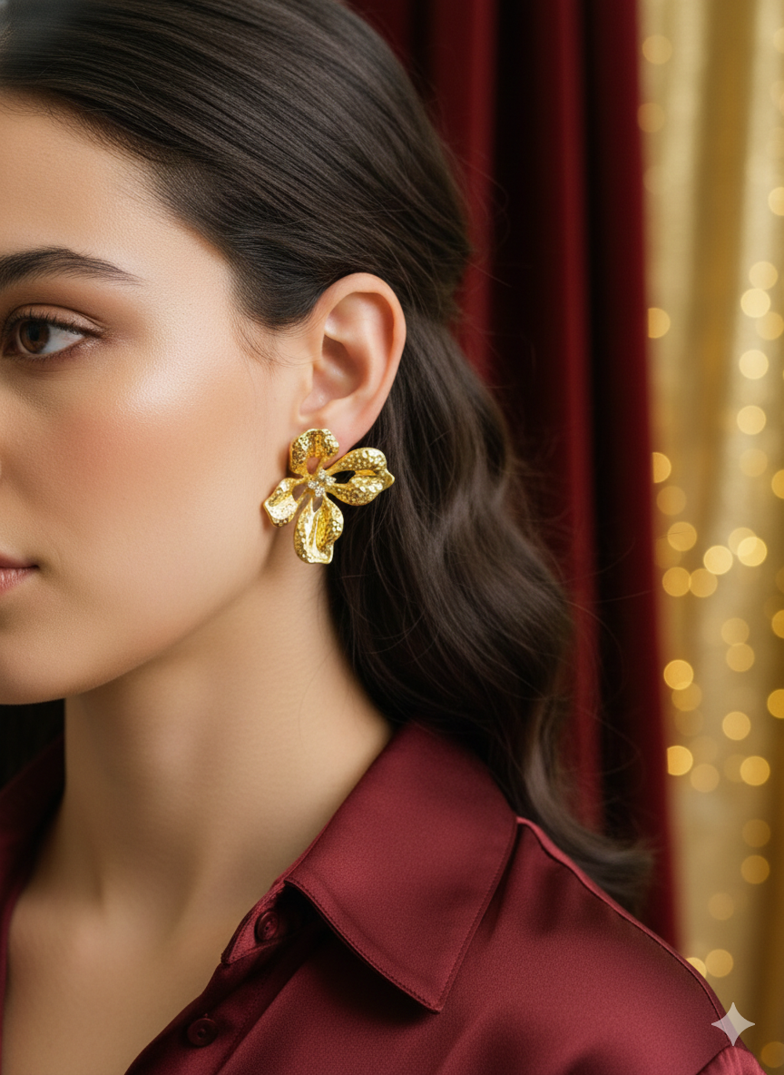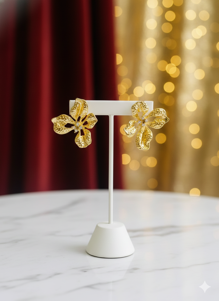 Bloom with elegance wearing these stunning statement earrings. The design features a double-drop floral motif, with a smaller flower sitting at the earlobe and a larger one cascading below. Crafted with a unique hammered gold texture, the petals have a “crushed metal” look that catches the light beautifully. Each flower is centered with a cluster of tiny clear crystals, adding a sparkling focal point to this organic, nature-inspired design.