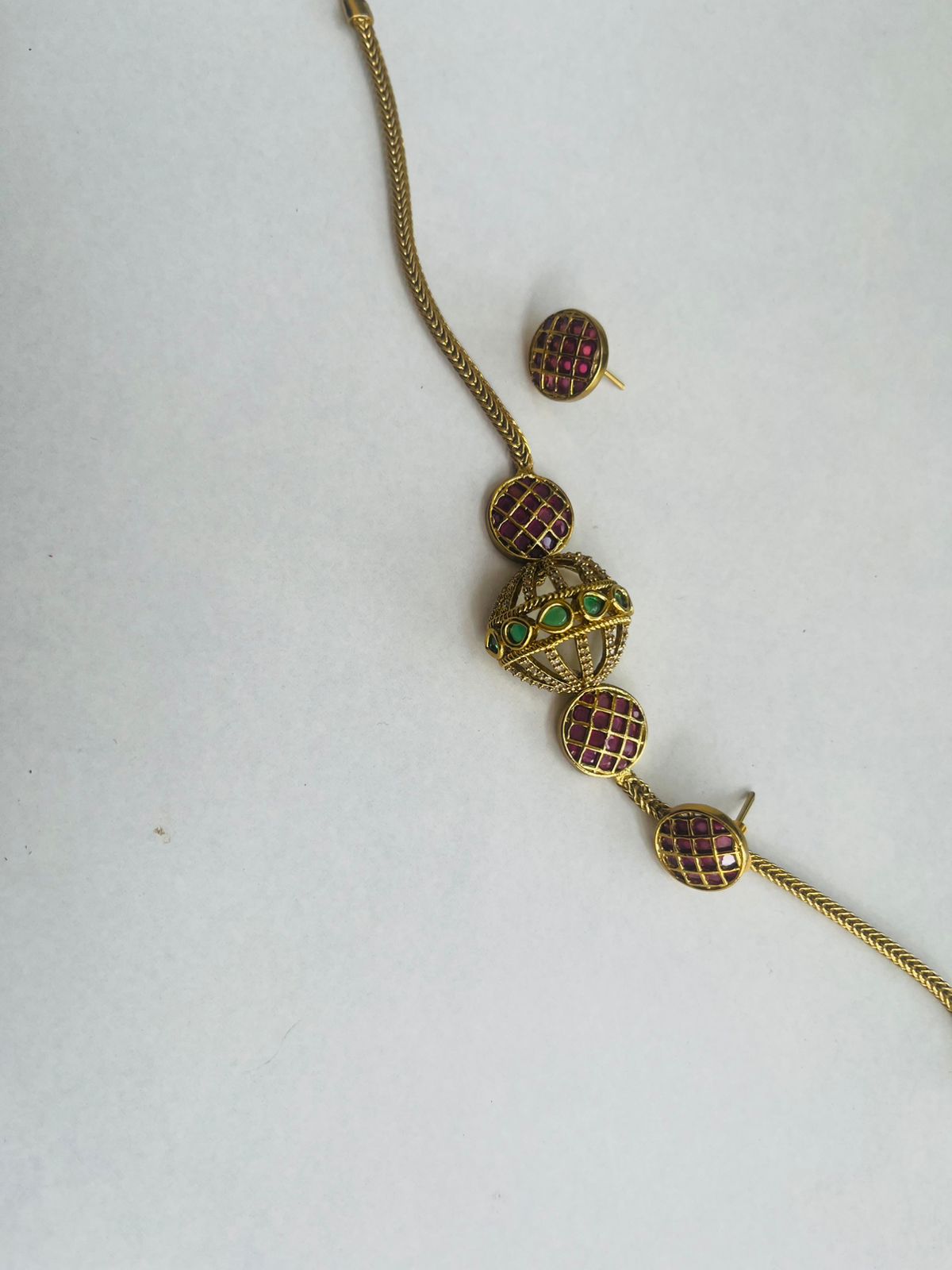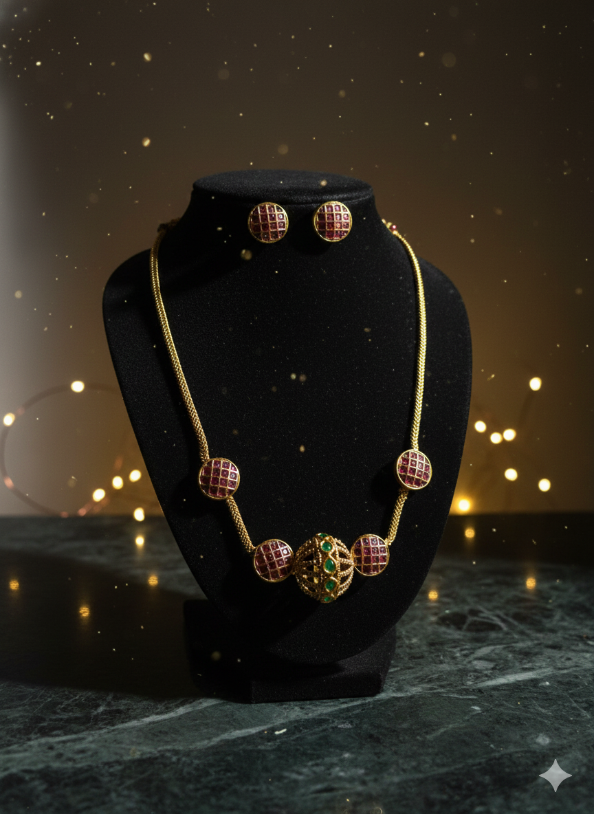 The centerpiece is a striking teardrop ruby red stone drop, adding a pop of rich color. The set includes matching geometric drop earrings, each showcasing a coordinating ruby stone.