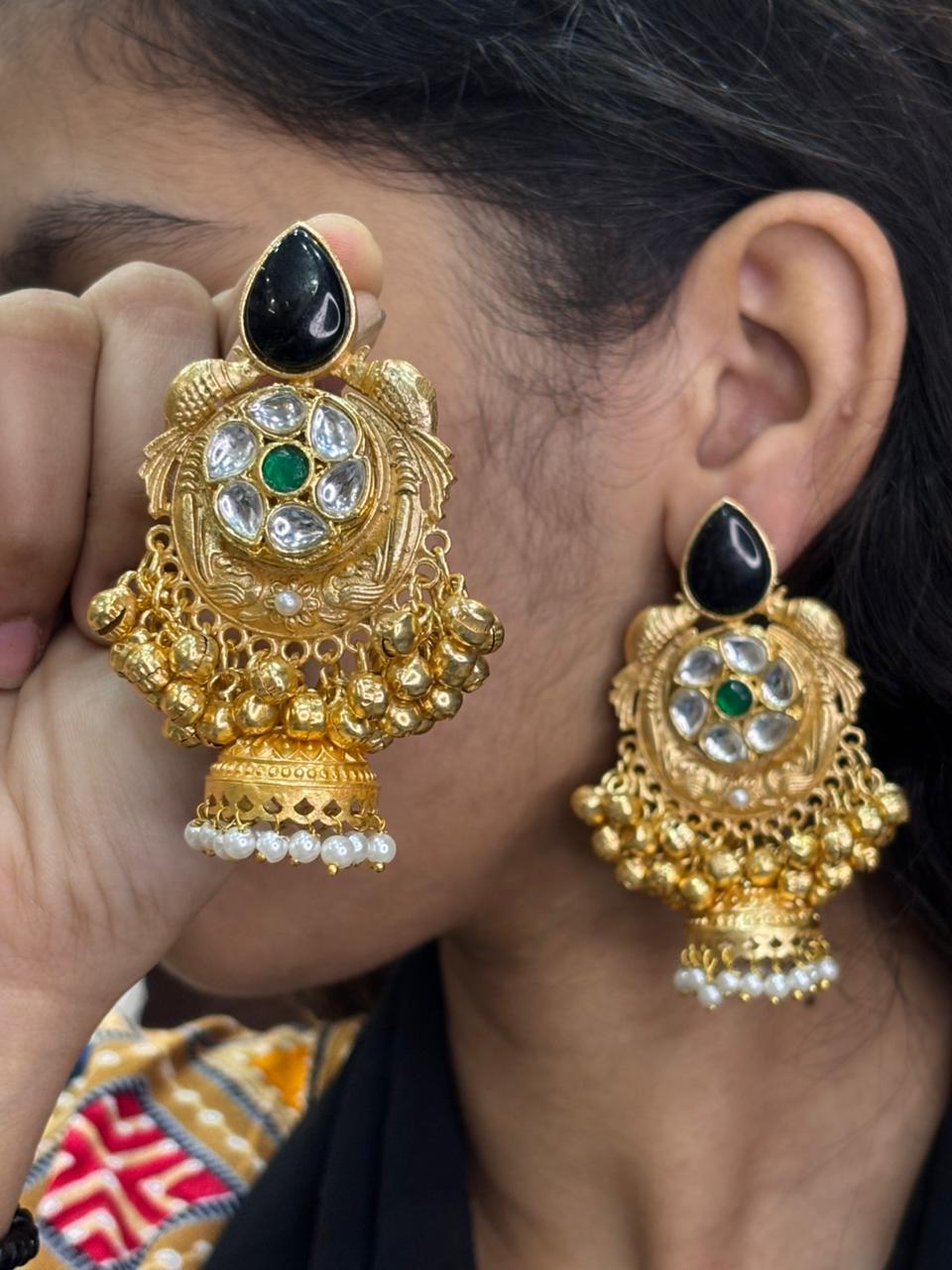 Adorn yourself with the timeless grandeur of The Kashmiri Jhumka Drops. These magnificent, oversized earrings are a masterpiece of traditional craftsmanship, blending intricate gold-plated filigree with Monalisa Stone accents and classic Kundan work.