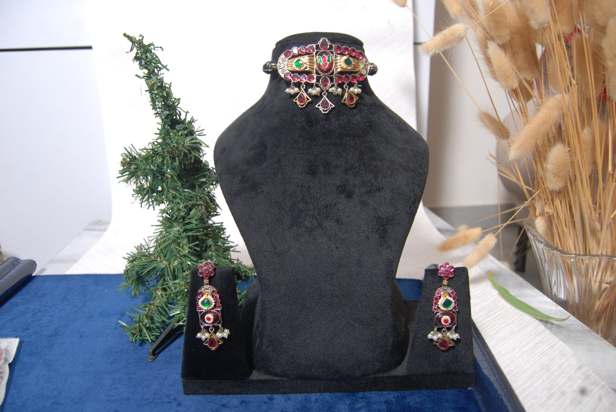 Make a striking statement with this exquisite silver replica choker necklace and earring set. This handcrafted piece features a bold, intricate design with vibrant red and green stones set throughout the choker and matching earrings. The traditional motifs and dazzling stone detailing create a rich, luxurious look that is both timeless and modern. This set is perfect for adding a touch of bold color and classic elegance to your festive wear, traditional outfits, or any special occasion.